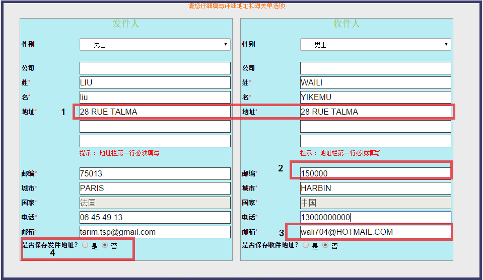 3.电子邮箱选项必须填写,希望尽量留自己的邮箱或是懂法语人的信箱, 不要留自己客户的邮箱,因为如果包裹出现异常或问题,法国邮局会通过这个邮箱与您取得联系。