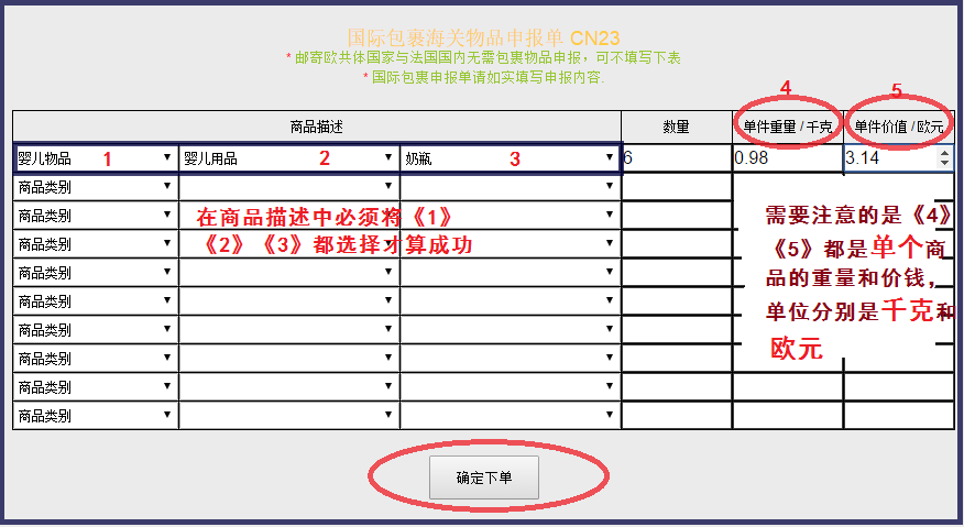 2.最后两列需要填写的是单品的重量和价格,单位分别是千克和欧元